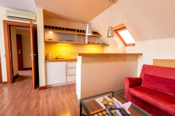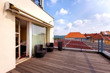 Sie möchten sich mehr Platz und Komfort gönnen? Die Junior Suite ist beliebt bei allen, die zu dritt reisen und die voll ausgestattete Küchenzeile zu schätzen wissen. Dieses Zimmer auf der 5. Etage verfügt über eine Terrasse und Blick auf die Dächer der umliegenden Häuser. Alle unsere Zimmer sind Nichtraucherzimmer.